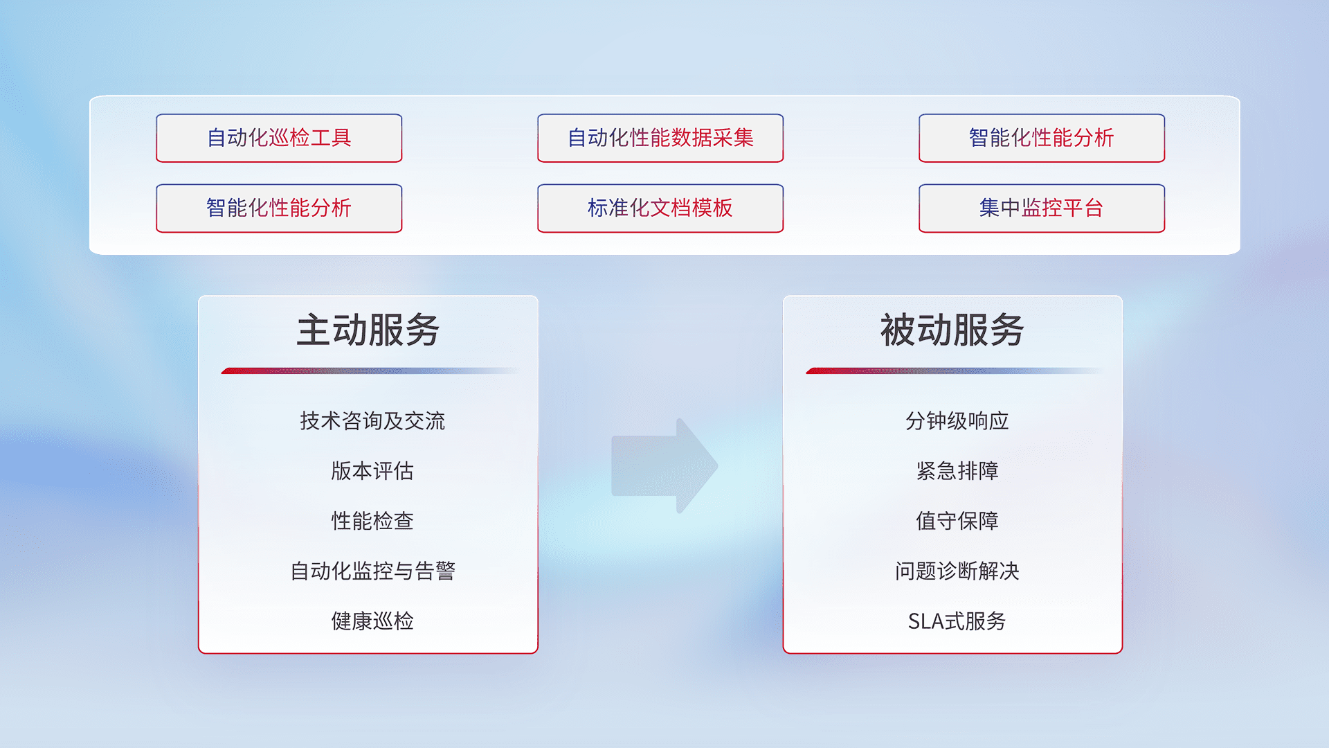 智能化工具和标准化文档,,,,保障服务质量,,,,提供主动服务(包含技术咨询、、版本评估、、、性能检查、、、自动化监控与告警、、、健康巡检)和被动服务包含(分钟级响应、、、紧急排障、、、值守保障、、、问题诊断解决、、、SLA服务)。。。